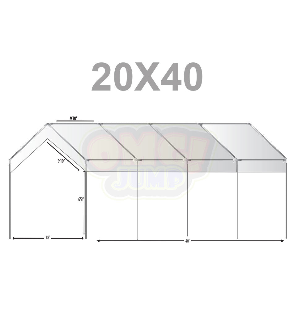 The 20’ x 40’ complete no windows canopy is a high peak “A” shaped frame canopy. The canopy includes a 20’x40’ valance tarp, a 20’ front side, a 20′ back side , two 40’